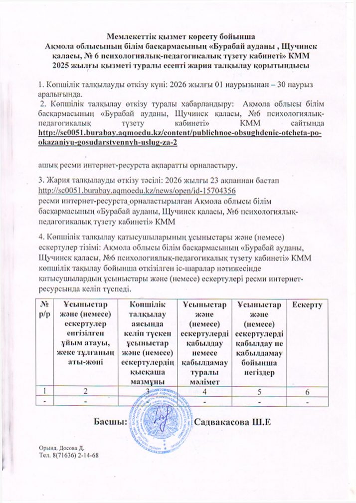 Мемлекеттік қызмет көрсету бойынша Ақмола облысының білім басқармасының «Бурабай ауданы , Щучинск қаласы, № 6 психологиялық-педагогикалық түзету кабинеті» КММ 2025 жылғы қызметі туралы есепті жария талқылау қорытындысы